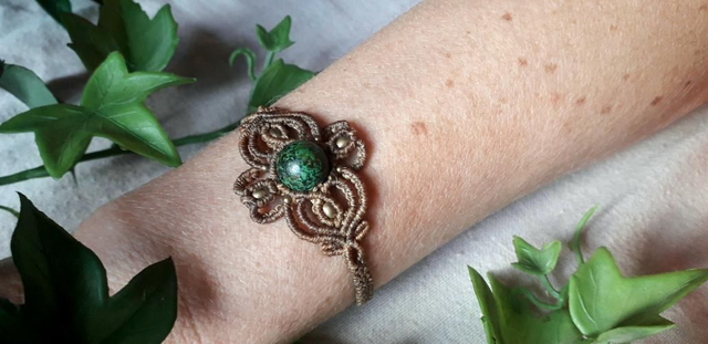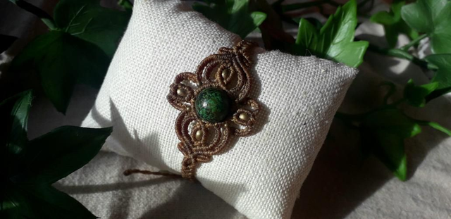 La perle située au centre du bracelet est une perle naturelle semi-précieuse de serpentine🐍les perles qui l'accompagnent sont en laiton.